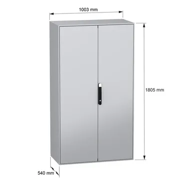 Spacial SM monobloc compact steel enclosure with 2 plain front doors. 1800 x 1000 x 500 mm. Back panel welded, without mounting plate. 4 point door locking system with handle DB 5mm. Steel made. Prote…