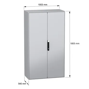 Spacial SM steel compact floor-standing enclosure is designed for a multi-purpose application It is suitable for use in harsh environments due to its IK10 rating (IEC62262) and its IP55 rating (IEC60529) provides high resistance to dust and water The enclosure has a nominal height, width and depth of 1800mm, 1000mm and 500mm respectively It is made of galvanised steel mounting plate, sheet steel body and door and zamak hinge The enclosure is grey (RAL7035) in color with an epoxy-polyester powder surface finish and the handle is black (RAL9005) It consists of a body, two plain doors, one cable gland plate, four mounting plate brackets, one mounting plate, a locking system with handle on the door and a blocking system on the left door The doors can be opened up to 120° for easy access to the equipment inside