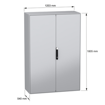 Spacial SM multi-purpose steel compact floor-standing enclosure is designed for use in harsh environments It has a nominal height, width and depth of 1800mm, 1200mm and 500mm respectively The enclosure is made of galvanised steel mounting plate, sheet steel body, sheet steel door and zamak hinge The enclosure is certified by DNV, UL and BV It can withstand high impact due its IK10 (IEC62262) and it has a high resistance to dust and water with an IP55 rating (IEC60529) The enclosure is grey (RAL 7035) with an epoxy-polyester powder surface finish and the handle is made in black color (RAL9005) The enclosure consists of a body, two cable gland plates, two plain doors, four mounting plate brackets, a blocking system on left door and a locking system with handle on the door