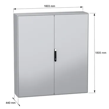 Spacial SM steel compact floor-standing enclosure is ideal for a multi-purpose application It is designed for use in harsh environments, it can withstand high impact due its IK10 (IEC62262) and it has a high resistance to dust and water with an IP55 rating (IEC60529) This enclosure has a nominal height, width and depth of 1800mm, 1600mm and 400mm respectively The enclosure is made in grey color (RAL7035) with an epoxy-polyester powder surface finish and the handle is made in black color (RAL9005) The enclosure consists of a body, two cable gland plates, two plain doors, four mounting plate brackets, a blocking system on left door and a locking system with handle on the door The doors can be opened up to 120°, allowing easy access to the equipment inside The enclosure has a four-point lock with a handle with 5mm double-bar insert