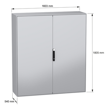 Spacial SM monobloc compact steel enclosure with 2 plain front doors. 1799 x 1600 x 500 mm. Back panel welded, without mounting plate. 4 point door locking system with handle DB 5mm. Steel made. Prote…