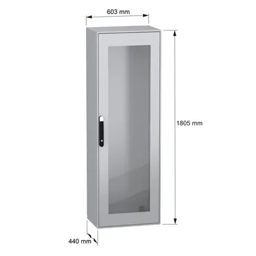 Spacial SM monobloc compact steel enclosure with glazed front door. 1799 x 800 x 400 mm. Back panel welded, without mounting plate. 4 point door locking system with handle DB 5mm. Sheet steel. Protection IP 55, IK08, Grey RAL 7035. 4 mounting plate support brackets included.