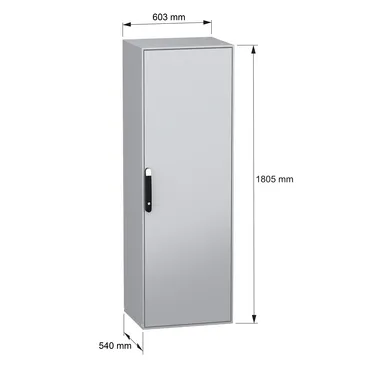 Spacial SM monobloc compact steel enclosure with plain front door. 1800 x 600 x 500 mm. Back panel welded, without mounting plate. 4 point door locking system with handle DB 5mm. Steel made. Protectio…