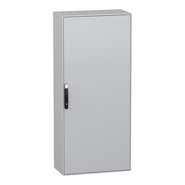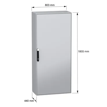 Spacial SM is a multi-purpose steel compact floor-standing enclosure designed for use in harsh environments It is certified by DNV, UL and BV, and it has a high impact resistance with an IK10 rating (IEC62262) as well as a high resistance to dust and water with an IP55 rating (IEC60529) This enclosure has a nominal height, width and depth of 1800mm, 800mm and 400mm respectively The enclosure is made in grey color (RAL7035) with an epoxy-polyester powder surface finish and the handle is made in black color (RAL9005) The enclosure consists of a body, a cable gland plate, a plain door, four mounting plate brackets, a mounting plate and a locking system with handle on the door The door can be opened up to 120°, allowing easy access to the equipment inside The enclosure has a four-point lock with a handle with 5mm double-bar insert