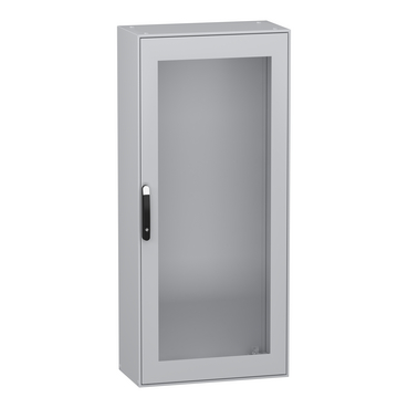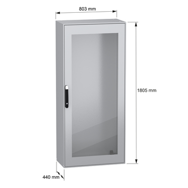 Spacial SM monobloc compact steel enclosure with glazed front door. 1800 x 800 x 400 mm. Back panel welded, without mounting plate. 4 point door locking system with handle DB 5mm. Sheet steel. Protection IP 55, IK08, Grey RAL 7035. 4 mounting plate support brackets included.