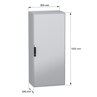 Spacial SM is a multi-purpose steel compact floor-standing enclosure designed for use in harsh environments It has a nominal height, width and depth of 1800mm, 800mm and 500mm respectively and is made in grey color (RAL7035) with an epoxy-polyester powder surface finish, while the handle is made in black color (RAL9005) The enclosure consists of a body, a cable gland plate, a locking system with handle on the door, four mounting plate brackets, one mounting plate, and one plain door The door can be opened up to 120° and is reversible, allowing easy access to the equipment inside The enclosure has a four-point lock with a handle with 5mm double-bar insert The door and the mounting plate can be removed for maintenance purposes The net weight of the enclosure is 129kg and it is certified by UL, BV and DNV