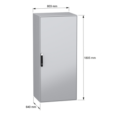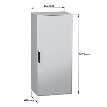 Spacial SM is a multi-purpose steel floor-standing enclosure with a nominal height, width and depth of 1800mm, 800mm and 600mm respectively It is designed for use in harsh environments, it can withstand high impact due its IK10 (IEC62262) and it has a high resistance to dust and water with an IP55 rating (IEC60529) The enclosure is made in grey color (RAL7035) with an epoxy-polyester powder surface finish and the handle is made in black color (RAL9005) It consists of a body, a cable gland plate, a locking system with handle on the door, four mounting plate brackets, a mounting plate and a door The door can be opened up to 120°, allowing easy access to the equipment inside The enclosure has a four-point lock with a handle with 5mm double-bar insert The door, mounting plate and mounting plate brackets can be removed for maintenance purposes
