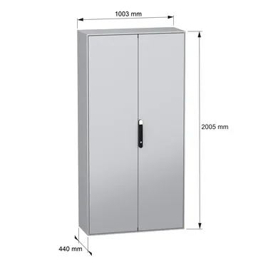 Spacial SM steel compact floor-standing enclosure for a multi-purpose application It is designed for use in harsh environments, it can withstand high impact due its IK10 (IEC62262) and it has a high resistance to dust and water with an IP55 rating (IEC60529) This enclosure has a nominal height, width and depth of 2000mm, 1000mm and 400mm respectively The enclosure is made in grey color (RAL7035) with an epoxy-polyester powder surface finish and the handle is made in black color (RAL9005) The enclosure consists of a body, one cable gland plate, two plain doors, four mounting plate brackets, a blocking system on left door and a locking system with handle on the door The doors can be opened up to 120°, allowing easy access to the equipment inside The enclosure has a four-point lock with a handle with 5mm double-bar insert