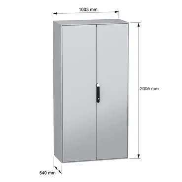 Spacial SM is a multi-purpose steel floor-standing enclosure designed for use in harsh environments It has a nominal height, width and depth of 2000mm, 1000mm and 500mm respectively The enclosure is made in grey color (RAL 7035) with an epoxy-polyester powder surface finish and the handle is made in black color (RAL 9005) The enclosure consists of a body, two plain doors, one cable gland plate, four mounting plate brackets, a blocking system on left door, a locking system with handle on the door, and a mounting plate made of galvanised steel The doors can be opened up to 120°, allowing easy access to the equipment inside The enclosure has a four-point lock with a handle with 5mm double-bar insert The doors and mounting plate brackets can be removed for maintenance purposes