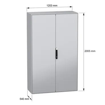 Spacial SM monobloc compact steel enclosure with 2 plain front doors. 2000 x 1200 x 500 mm. Back panel welded, without mounting plate. 4 point door locking system with handle DB 5mm. Steel made. Prote…