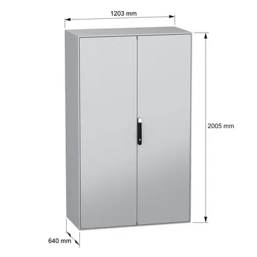 Spacial SM monobloc compact steel enclosure with 2 plain front doors. 2000 x 1200 x 600 mm. Back panel welded, without mounting plate. 4 point door locking system with handle DB 5mm. Steel made. Prote…