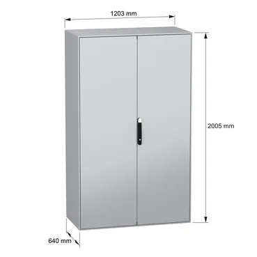 Spacial SM steel compact floor-standing enclosure is designed for a multi-purpose application It is made to withstand harsh environments, with an IK10 (IEC62262) rating and an IP55 rating (IEC60529) It has a nominal height, width and depth of 2000mm, 1200mm and 600mm respectively The enclosure is made in grey color (RAL7035) with an epoxy-polyester powder surface finish and the handle is made in black color (RAL9005) The enclosure consists of a body, two cable gland plates, two plain doors, four mounting plate brackets, a blocking system on left door, a locking system with handle on the door and a mounting plate The doors can be opened up to 120°, allowing easy access to the equipment inside The enclosure has a four-point lock with a handle with 5mm double-bar insert