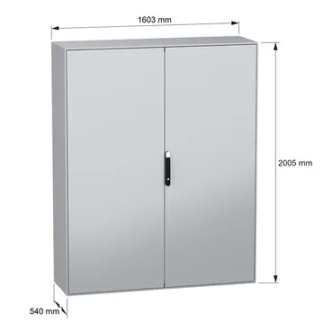 Spacial SM monobloc compact steel enclosure with 2 plain front doors. 2000 x 1600 x 500 mm. Back panel welded, without mounting plate. 4 point door locking system with handle DB 5mm. Steel made. Prote…