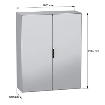 Spacial SM steel compact floor-standing enclosure for a multi-purpose application It is designed for use in harsh environments, it can withstand high impact due to its IK10 (IEC62262) and it has a high resistance to dust and water with an IP55 rating (IEC60529) This enclosure has a nominal height, width and depth of 2000mm, 1600mm and 600mm respectively The enclosure is made in grey color (RAL7035) with an epoxy-polyester powder surface finish and the handle is made in black color (RAL9005) The enclosure consists of a body, two cable gland plates, two plain doors, four mounting plate brackets, a blocking system on the left door, a locking system with handle on the door and a mounting plate The doors can be opened up to 120°, allowing easy access to the equipment inside The enclosure has a four-point lock with a handle with 5mm double-bar insert