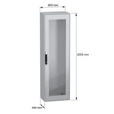Spacial SM monobloc compact steel enclosure with glazed front door. 2000 x 600 x 400 mm. Back panel welded, without mounting plate. 4 point door locking system with handle DB 5mm. Sheet steel. Protection IP 55, IK08, Grey RAL 7035. 4 mounting plate support brackets included.