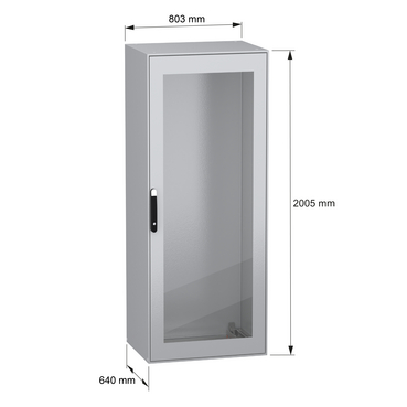 Spacial SM monobloc compact steel enclosure with glazed door. 2000 x 800 x 600 mm. Back panel welded. 4 point door locking system with handle DB 5mm. Steel made. Protection IP 55, IK08, Grey RAL 7035….