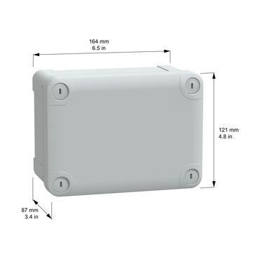 This TBP is a wall-mounted multi-purpose box made of polycarbonate It has a nominal height, width, and depth of 164 mm, 121 mm, and 87 mm, respectively The internal dimensions of the box are 150 mm x 105 mm x 80 mm The box is one-piece moulded and has a grey (RAL 7035) body with a low plain cover that is secured with plastic screws The cover is closed by four captive flat screws located outside the sealed area of the box to maintain IP It is certified by TÜV and UL, and is resistant to fire up to 960°C in accordance with IEC 62208 standard The box offers high protection against dust and water with an IP66 rating (NEMA 4,4X) and is impact resistant with an IK08 rating (IEC 62262)