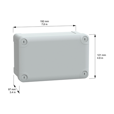 This TBP is a wall-mounted box made of polycarbonate It is designed for multi-purpose applications and can be used indoor or outdoor The box has a grey (RAL 7035) body and a low plain cover The enclosure has a nominal height, width, and depth of 192 mm, 121 mm, and 87 mm, respectively The internal dimensions of the box are 175 mm x 105 mm x 80 mm The cover is closed by four captive flat screws located outside the sealed area of the box to maintain IP The box has a class II electrical insulation that prevents electric shocks and allows the building of totally insulated solutions