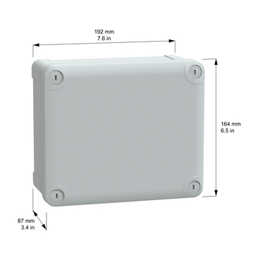 This TBP is a wall-mounted box made of polycarbonate It is designed for multi-purpose applications and can be used indoor or outdoor The box has a grey (RAL 7035) body and a low plain cover The enclosure has a nominal height, width, and depth of 192 mm, 164 mm, and 87 mm, respectively The internal dimensions of the box are 175 mm x 150 mm x 80 mm The cover is closed by four captive flat screws located outside the sealed area of the box to maintain IP The box has a class II electrical insulation that prevents electric shocks and allows the building of totally insulated solutions