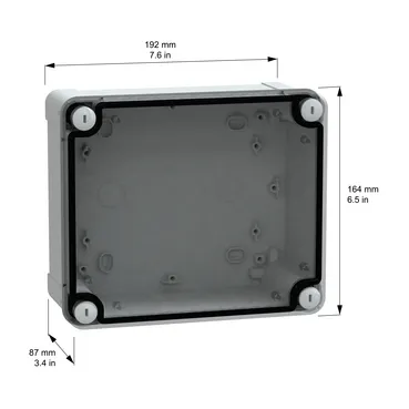 This TBP is a wall-mounted box made of polycarbonate It is designed for multi-purpose applications and can be used indoor or outdoor The box has a grey (RAL 7035) body and a low transparent cover The enclosure has a nominal height, width, and depth of 192 mm, 164 mm, and 87 mm, respectively The internal dimensions of the box are 175 mm x 150 mm x 80 mm The cover is closed by four captive flat screws located outside the sealed area of the box to maintain IP The box has a class II electrical insulation that prevents electric shocks and allows the building of totally insulated solutions