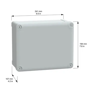 This TBP is a wall-mounted box made of polycarbonate It is designed for multi-purpose applications and can be used indoor or outdoor The box has a grey (RAL 7035) body and a low plain cover The enclosure has a nominal height, width, and depth of 241 mm, 194 mm, and 107 mm, respectively The internal dimensions of the box are 225 mm x 175 mm x 100 mm The cover is closed by four captive flat screws located outside the sealed area of the box to maintain IP The box has a class II electrical insulation that prevents electric shocks and allows the building of totally insulated solutions