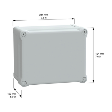 This TBP is a wall-mounted box made of polycarbonate It is designed for multi-purpose applications and can be used indoor or outdoor The box has a grey (RAL 7035) body and a high plain cover The enclosure has a nominal height, width, and depth of 241 mm, 194 mm, and 127 mm, respectively The internal dimensions of the box are 225 mm x 175 mm x 120 mm The cover is closed by four captive flat screws located outside the sealed area of the box to maintain IP The box has a class II electrical insulation that prevents electric shocks and allows the building of totally insulated solutions