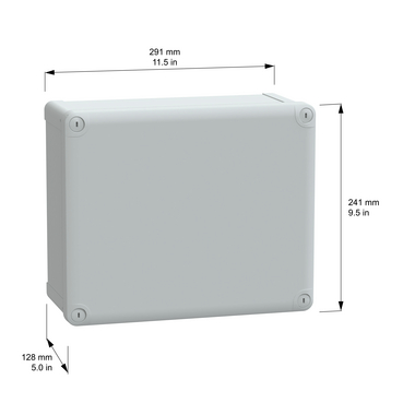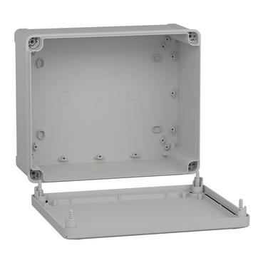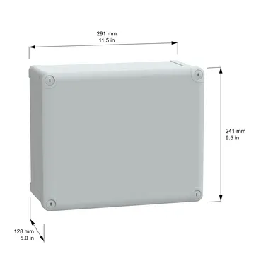 This TBP is a wall-mounted box made of polycarbonate It is designed for multi-purpose applications and can be used indoor or outdoor The box has a grey (RAL 7035) body and a low plain cover The enclosure has a nominal height, width, and depth of 291 mm, 241 mm, and 128 mm, respectively The internal dimensions of the box are 275 mm x 225 mm x 120 mm The cover is closed by four captive flat screws located outside the sealed area of the box to maintain IP The box has a class II electrical insulation that prevents electric shocks and allows the building of totally insulated solutions