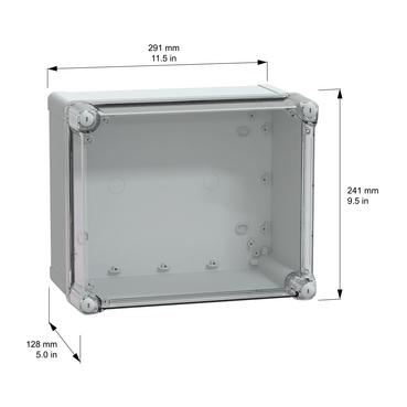 This TBP is a wall-mounted box made of polycarbonate It is designed for multi-purpose applications and can be used indoor or outdoor The box has a grey (RAL 7035) body and a high transparent cover The enclosure has a nominal height, width, and depth of 291 mm, 241 mm, and 128 mm, respectively The internal dimensions of the box are 275 mm x 225 mm x 120 mm The cover is closed by four captive flat screws located outside the sealed area of the box to maintain IP The box has a class II electrical insulation that prevents electric shocks and allows the building of totally insulated solutions