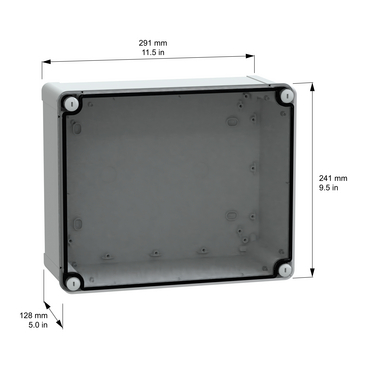 This TBP is a wall-mounted box made of polycarbonate It is designed for multi-purpose applications and can be used indoor or outdoor The box has a grey (RAL 7035) body and a low transparent cover The enclosure has a nominal height, width, and depth of 291 mm, 241 mm, and 128 mm, respectively The internal dimensions of the box are 275 mm x 225 mm x 120 mm The cover is closed by four captive flat screws located outside the sealed area of the box to maintain IP The box has a class II electrical insulation that prevents electric shocks and allows the building of totally insulated solutions