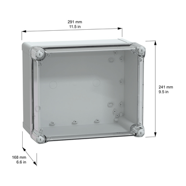 This TBP is a wall-mounted box made of polycarbonate It is designed for multi-purpose applications and can be used indoor or outdoor The box has a grey (RAL 7035) body and a high transparent cover The enclosure has a nominal height, width, and depth of 291 mm, 241 mm, and 168 mm, respectively The internal dimensions of the box are 275 mm x 225 mm x 160 mm The cover is closed by four captive flat screws located outside the sealed area of the box to maintain IP The box has a class II electrical insulation that prevents electric shocks and allows the building of totally insulated solutions