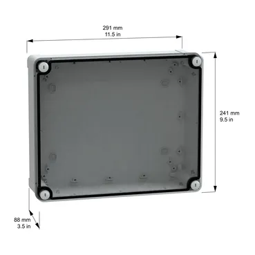 This TBP is a wall-mounted box made of polycarbonate It is designed for multi-purpose applications and can be used indoor or outdoor The box has a grey (RAL 7035) body and a low transparent cover The enclosure has a nominal height, width, and depth of 291 mm, 241 mm, and 88 mm, respectively The internal dimensions of the box are 275 mm x 225 mm x 80 mm The cover is closed by four captive flat screws located outside the sealed area of the box to maintain IP The box has a class II electrical insulation that prevents electric shocks and allows the building of totally insulated solutions