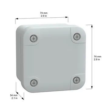 This TBP is a wall-mounted box made of polycarbonate It is designed for multi-purpose applications and can be used indoor or outdoor The box has a grey (RAL 7035) body and a low plain cover The enclosure has a nominal height, width, and depth of 74 mm, 74 mm, and 54 mm, respectively The internal dimensions of the box are 65 mm x 65 mm x 47 mm The cover is closed by four captive flat screws located outside the sealed area of the box to maintain IP The box has a class II electrical insulation that prevents electric shocks and allows the building of totally insulated solutions