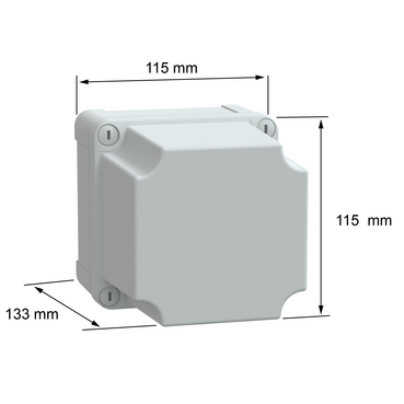 This TBS is a wall-mounted box made of ABS that is suitable for multi-purpose applications The box has a height, width, and depth of 116 mm, 116 mm, and 133 mm, respectively The internal dimensions of the box are 105 mm x 105 mm x 125 mm The box is made of ABS (acrylonitrile butadiene-styrene), which offers resistance to impact and high temperatures The box comes in a grey (RAL 7035) color It has a high plain cover that is fixed with captive flat screws The box has a class II electrical insulation that prevents electric shocks and allows the building of totally insulated solutions