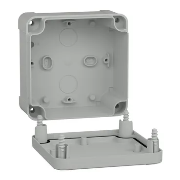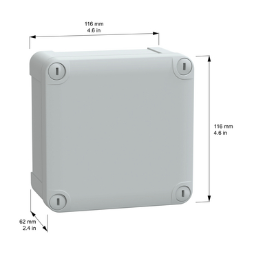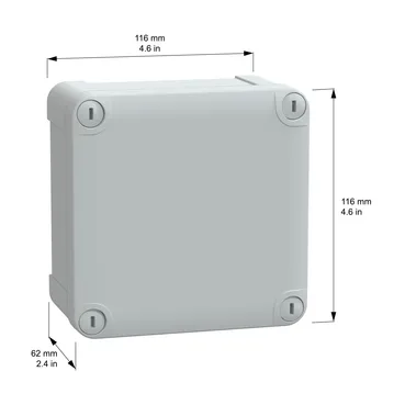 This TBS is a wall-mounted box made of ABS that is suitable for multi-purpose applications The box has a height, width, and depth of 116 mm, 116 mm, and 62 mm, respectively The internal dimensions of the box are 105 mm x 105 mm x 55 mm The box is made of ABS (acrylonitrile butadiene-styrene), which offers resistance to impact and high temperatures The box comes in a grey (RAL 7035) color It has a low plain cover that is fixed with captive flat screws The box has a class II electrical insulation that prevents electric shocks and allows the building of totally insulated solutions