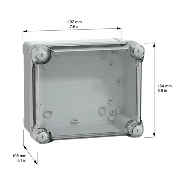 This TBS is a wall-mounted box made of ABS that is suitable for multi-purpose applications The box has a height, width, and depth of 192 mm, 164 mm, and 105 mm, respectively The internal dimensions of the box are 175 mm x 150 mm x 100 mm The box is made of ABS (acrylonitrile butadiene-styrene), which offers resistance to impact and high temperatures The box comes in a grey (RAL 7035) color and has a high transparent cover It is fixed with captive flat screws The box has a class II electrical insulation that prevents electric shocks and allows the building of totally insulated solutions
