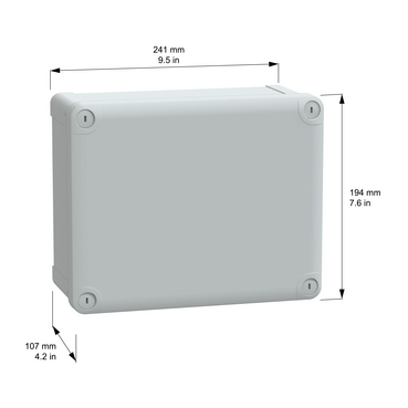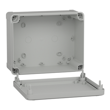 This TBS is a wall-mounted box made of ABS that is suitable for multi-purpose applications The box has a height, width, and depth of 241 mm, 194 mm, and 107 mm, respectively The internal dimensions of the box are 225 mm x 175 mm x 100 mm The box is made of ABS (acrylonitrile butadiene-styrene), which offers resistance to impact and high temperatures The box comes in a grey (RAL 7035) color It has a low plain cover that is fixed with captive flat screws The box has a class II electrical insulation that prevents electric shocks and allows the building of totally insulated solutions