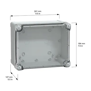This TBS is a wall-mounted box made of ABS that is suitable for multi-purpose applications The box has a height, width, and depth of 241 mm, 194 mm, and 127 mm, respectively The internal dimensions of the box are 225 mm x 175 mm x 120 mm The box is made of ABS (acrylonitrile butadiene-styrene), which offers resistance to impact and high temperatures The box comes in a grey (RAL 7035) color with a high transparent cover It has a class II electrical insulation that prevents electric shocks and allows the building of totally insulated solutions It is also resistant to fire up to 650°C in accordance with IEC 60695-2-11 standard