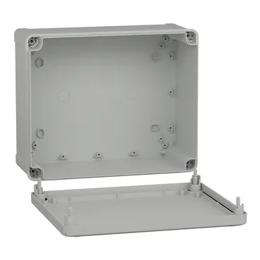 This TBS is a wall-mounted box made of ABS that is suitable for multi-purpose applications The box has a height, width, and depth of 291 mm, 241 mm, and 128 mm, respectively The internal dimensions of the box are 275 mm x 225 mm x 120 mm The box is made of ABS (acrylonitrile butadiene-styrene), which offers resistance to impact and high temperatures The box comes in a grey (RAL 7035) color It has a low plain cover that is fixed with captive flat screws The box has a class II electrical insulation that prevents electric shocks and allows the building of totally insulated solutions