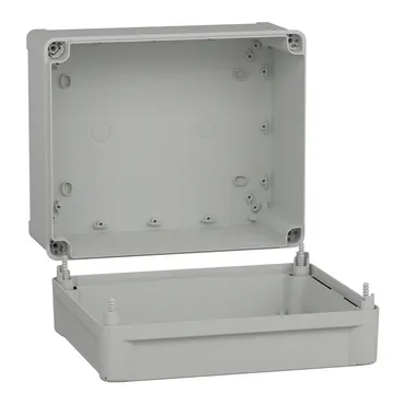 This TBS is a wall-mounted box made of ABS that is suitable for multi-purpose applications The box has a height, width, and depth of 291 mm, 241 mm, and 168 mm, respectively The internal dimensions of the box are 275 mm x 225 mm x 160 mm The box is made of ABS (acrylonitrile butadiene-styrene), which offers resistance to impact and high temperatures The box comes in a grey (RAL 7035) color It has a high plain cover that is fixed with captive flat screws The box has a class II electrical insulation that prevents electric shocks and allows the building of totally insulated solutions