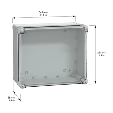 This TBS is a wall-mounted box made of ABS that is suitable for multi-purpose applications The box has a height, width, and depth of 341 mm, 291 mm, and 168 mm, respectively The internal dimensions of the box are 325 mm x 275 mm x 160 mm The box is made of ABS (acrylonitrile butadiene-styrene), which offers resistance to impact and high temperatures The box comes in a grey (RAL 7035) color with a high transparent cover It is fixed with plastic screws and has a captive screw flat outside sealed area The box has a class II electrical insulation that prevents electric shocks and allows the building of totally insulated solutions