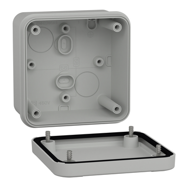 This TBS is a wall-mounted box made of ABS that is suitable for multi-purpose applications The box has a height, width, and depth of 89 mm, 89 mm, and 54 mm, respectively The internal dimensions of the box are 80 mm x 80 mm x 47 mm The box is made of ABS (acrylonitrile butadiene-styrene), which offers resistance to impact and high temperatures The box comes in a grey (RAL 7035) color It has a low plain cover that is fixed with metal screws The box has a class II electrical insulation that prevents electric shocks and allows the building of totally insulated solutions