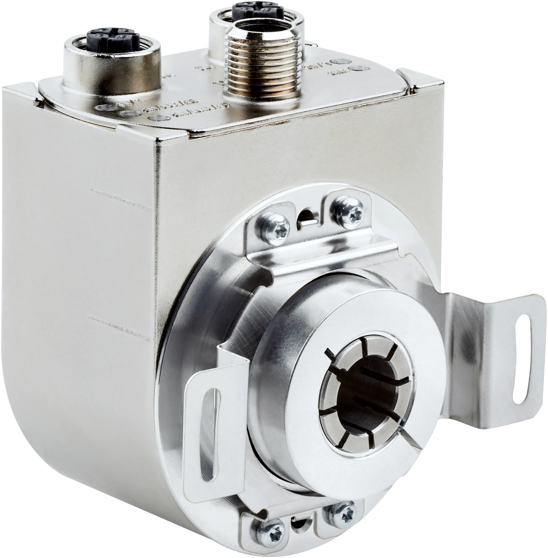 Absolute encoders | ANS/ANM58 | ANM58B-BGNNA000000200AXX018X16 | Singleturn or multiturn version: Multiturn | Max. resolution: 18 bit x 16 bit (262,144 x 65,536) | Mechanical design: Blind hollow shaft 14 mm (Front clamp) | Communication interface: PROFINET, programmable | Connection type: Male connector, 1x, M12, 4-pin, radial, Female connector, 2x, M12, 4-pin, radial | Programming interface: Over PLC-Engineering-Tool