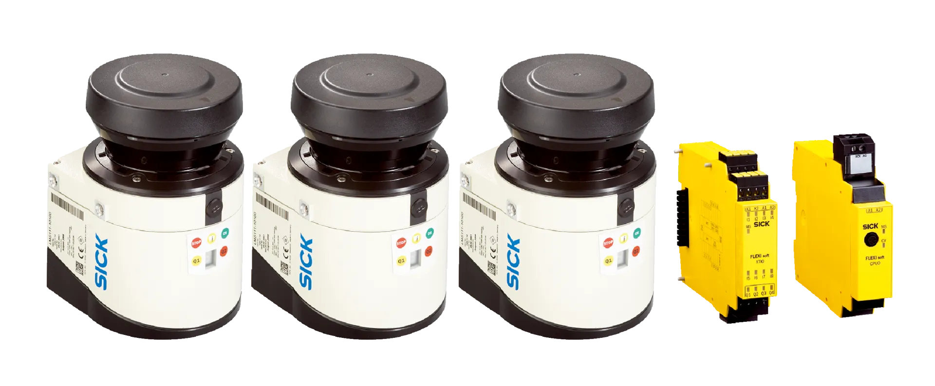 Object detection systems | AOS LiDAR | AOS103 | Control configuration: Area monitoring and collision avoidance | Items supplied: LMS111-10100S01 (3 x), Flexi Soft main module FX3-CPU000000, Flexi Soft system plug FX3-MPL000001, Flexi Soft I/O module FX3-XTIO84002 (2 x), USB configuration cable, USB stick with configuration files, Connection box LMS1xx (3x), Mounting kit for LMS1xx (3x), Ethernet connection cable