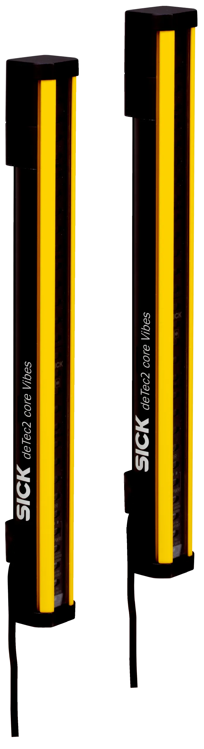 Safety light curtains | deTec | C2C-SV07530A10000, C2C-EV07530A10000 | Product version: deTec2 Core Vibes | System part: Pair | Application: Machines with strong shock or vibration loads | Safety level: PL c, SIL 1, Type 2 | Resolution: 30 mm | Scanning range: 15 m | Protective field height: 750 mm | Connection type: Plug, M12, 5-pin | Enclosure rating: IP65, IP67 | Items supplied: Sender, receiver, test rod with diameter corresponding to the resolution of the safety light curtain, safety instruction, Mounting instructions, Operating instructions for download