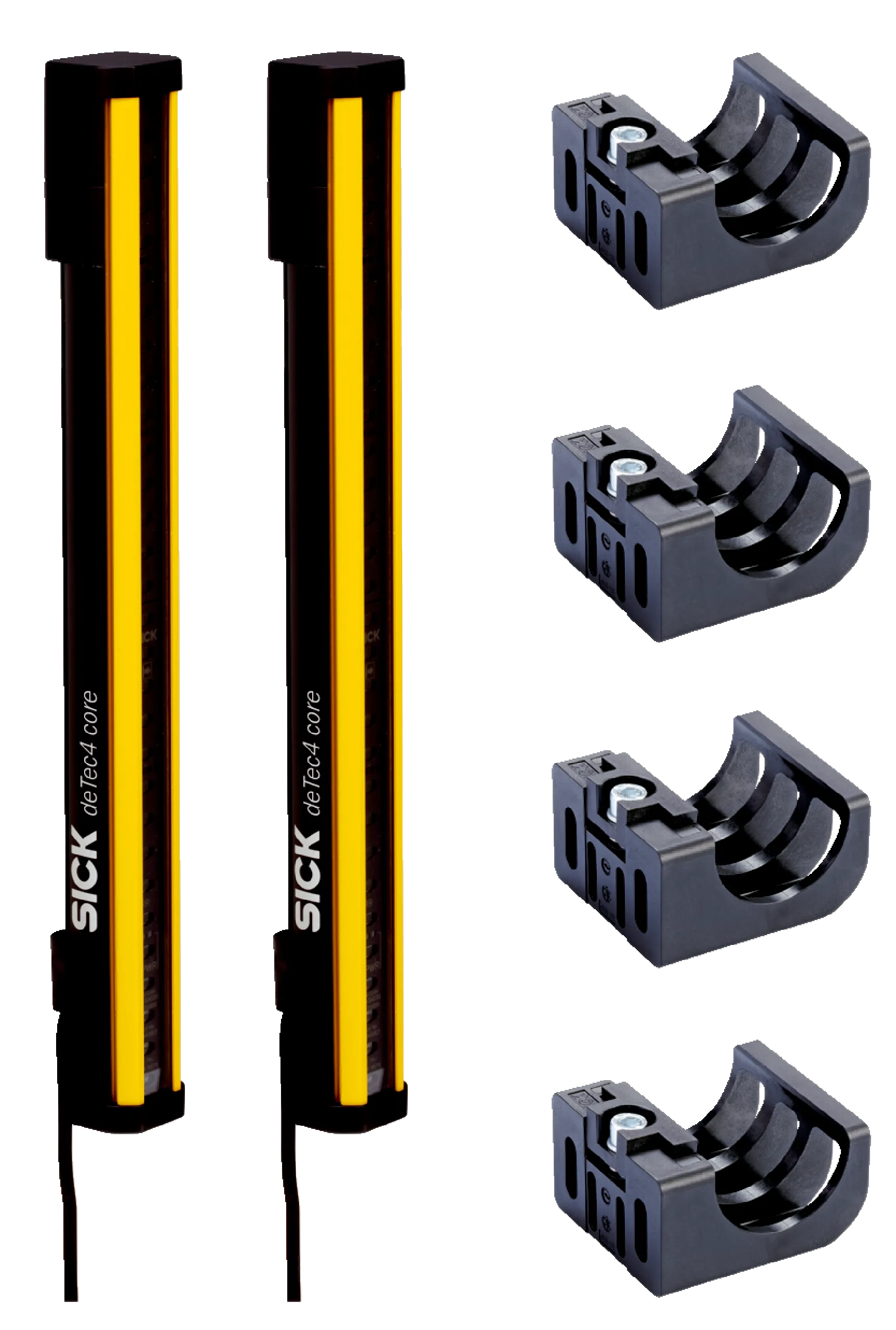 Safety light curtains | deTec | C4C-PA10530A10000 / BEF-1SHABPKU4 SET | Product version: deTec4 Core | System part: Set | Application: Normal industrial environment | Safety level: PL e, SIL 3, Type 4 | Resolution: 30 mm | Scanning range: 15 m | Protective field height: 1,050 mm | Connection type: Plug, M12, 5-pin | Enclosure rating: IP65, IP67 | Items supplied: Sender, receiver, 4Â FlexFix brackets, test rod with diameter corresponding to the resolution of the safety light curtain, safety instruction, Mounting instructions, Operating instructions for download