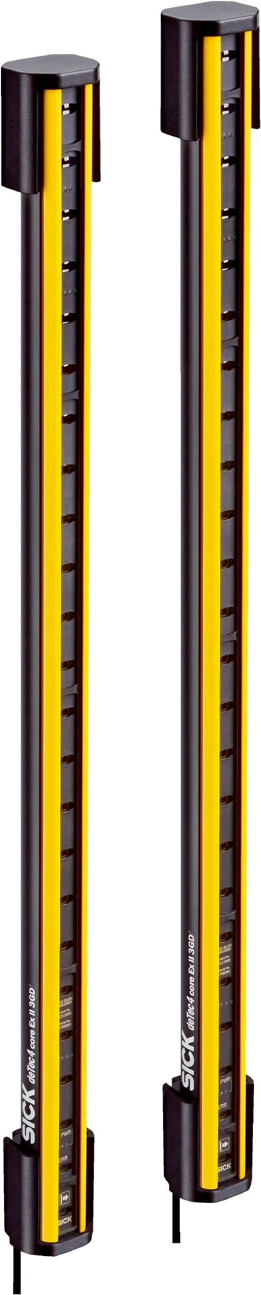 Safety light curtains | deTec | C4C-SX09010A10000, C4C-EX09010A10000 | Product version: deTec4 Core Ex II 3GD | System part: Pair | Application: Explosive areas | Ex-approvals: Ex II 3G/3D | Safety level: PL e, SIL 3, Type 4 | Resolution: 14 mm | Scanning range: 10 m | Protective field height: 900 mm | Connection type: Plug, M12, 5-pin | Enclosure rating: IP65, IP67 | Items supplied: Sender, receiver, test rod with diameter corresponding to the resolution of the safety light curtain, “Notes for explosion protection” label(s), safety instruction, Mounting instructions, Operating instructions for download