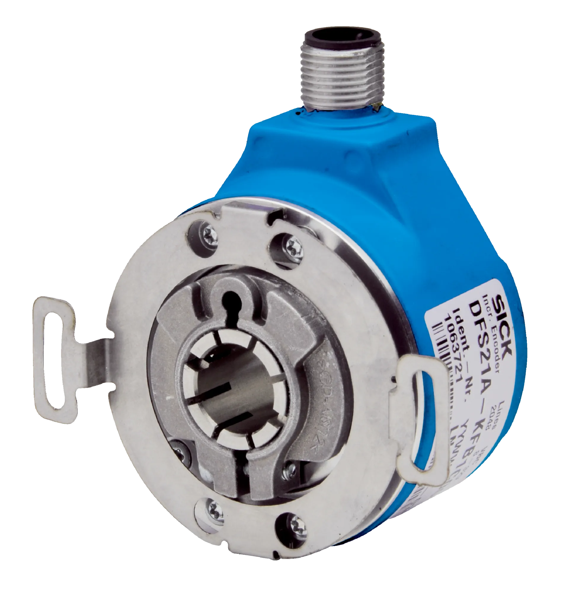 Incremental encoders | DFS2x | DFS21A-KFA1C065536 | Mechanical design: Through hollow shaft 1/2″ (Front clamp) | Communication interface: 4.5 V … 5.5 V, TTL, RS-422, non programmable | Connection type: Male connector, M12, 8-pin, radial | Pulses per revolution: 65,536 | Flange type / stator coupling: 2-point stator coupling