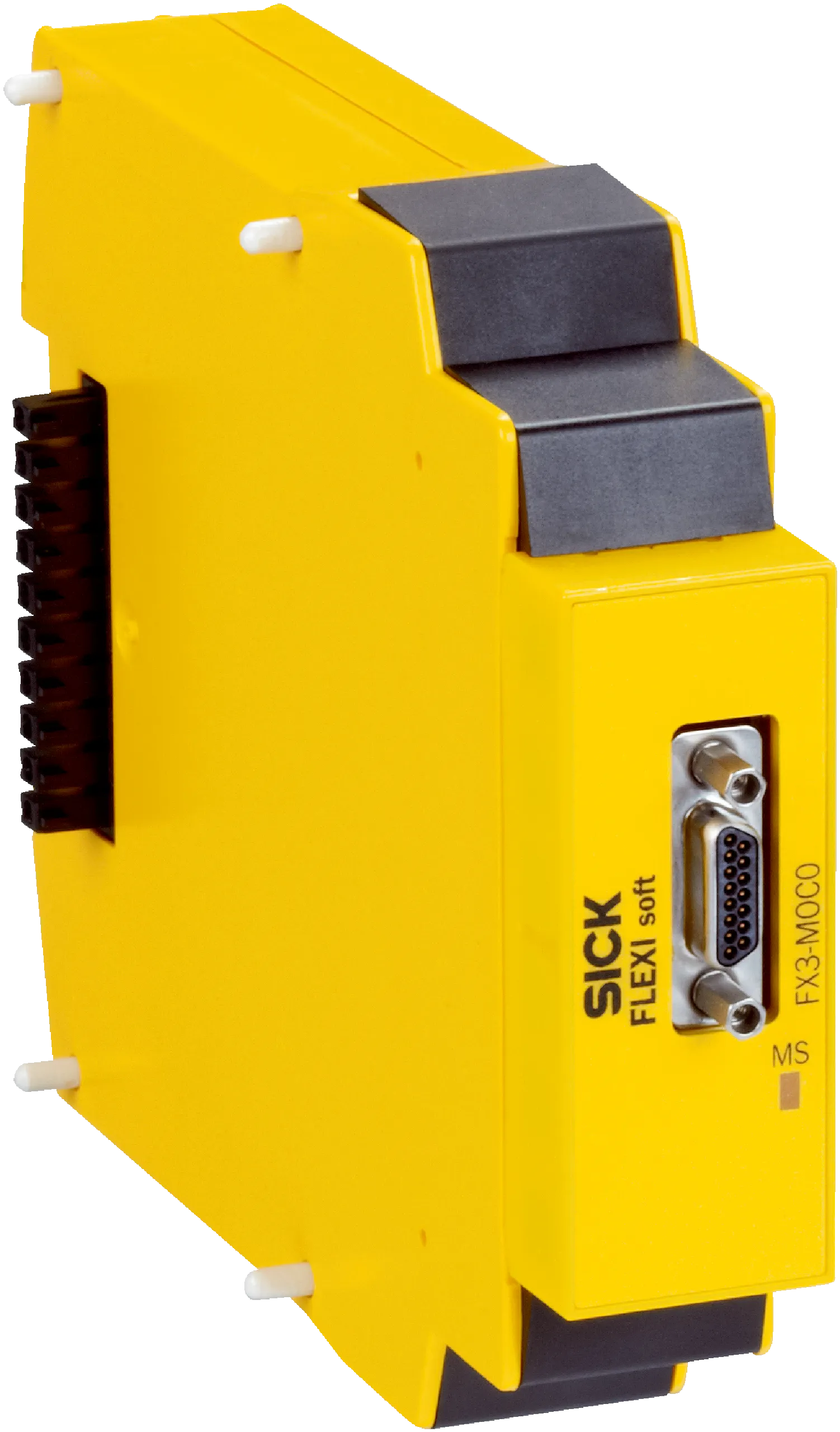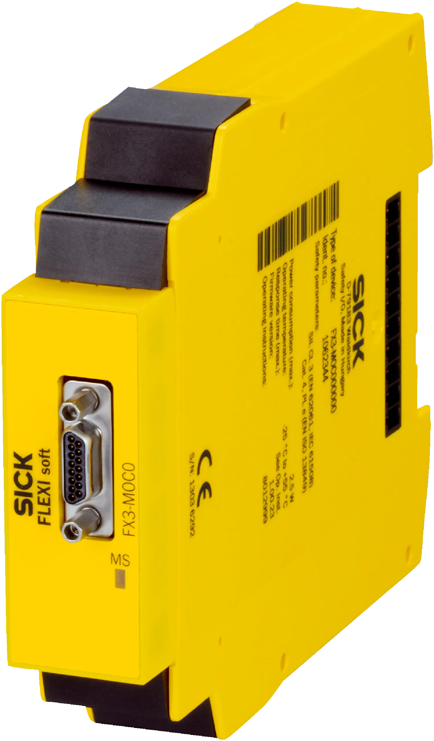 Safety controllers | Flexi Soft | FX3-MOC000000 | Module: Motion Control module | Connection type: Male connector, Micro D-Sub, 15-pin | Encoder interface: A/B incremental encoder, TTL, A/B incremental encoder, HTL 12 V or 24 V, A/B incremental encoder, RS-422, Sin/cos encoder, SSI encoder (master / listener), HIPERFACE® | Drive safety functions: Safe stop 1 (SS1), safe stop 2 (SS2), safe operating stop (SOS), safe speed monitoring (SSM), safely-limited speed (SLS), safe direction (SDI), safe brake control (SBC) | Protective coating for more challenging ambient conditions: no