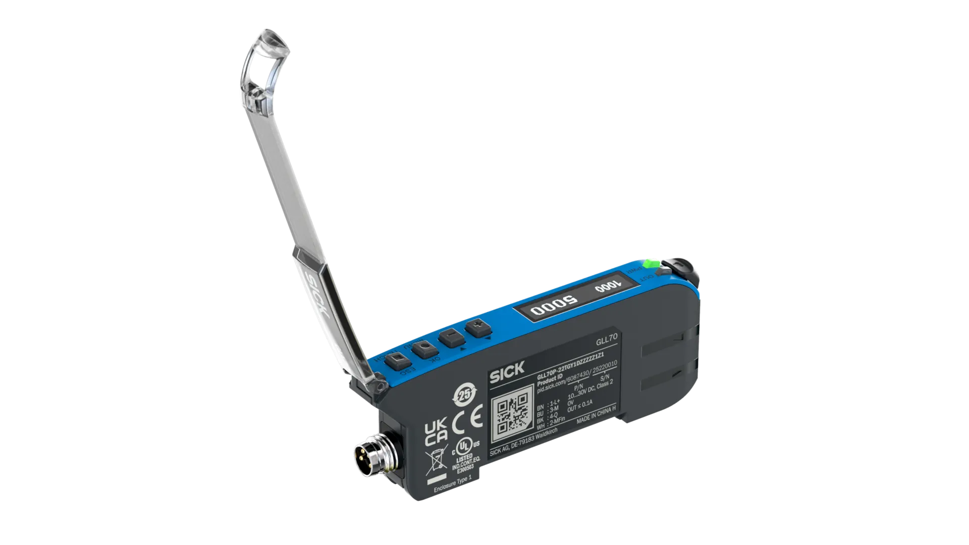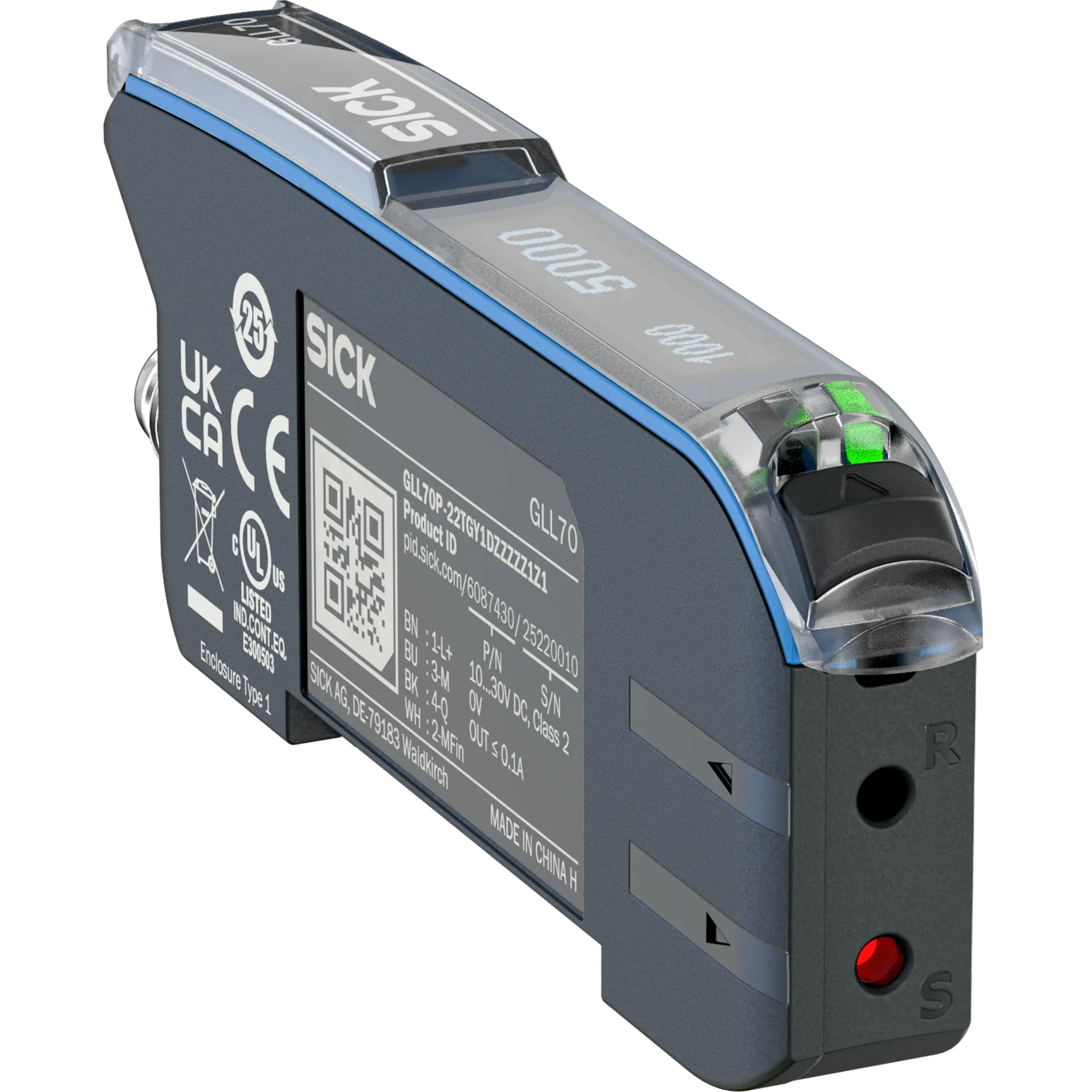 Fiber-optic sensors | GLL70 | GLL70P-22TGY1DZZZZZ1Z1 | Device type: Fiber-optic amplifier | Device type detail: Stand-alone | Switching output: PNP, NPN: open collector | Connection type: Male connector M8, 4-pin | Type of light: Visible red light | Adjustment: Teach-in button, cable, Menu-controlled | Display: OLED display | Smart Sensor: Enhanced Sensing, efficient communication, Smart Task
