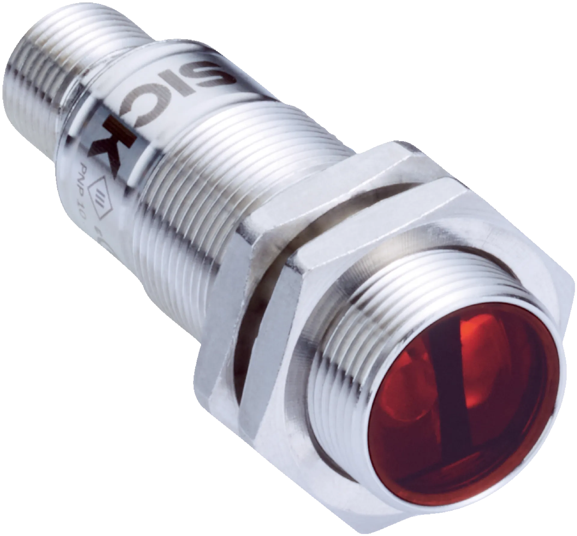 Photoelectric sensors | GR18 | GRTB18S-P2431V | Functional principle: Photoelectric proximity sensor | Functional principle detail: Background suppression | Switching output: PNP | Switching mode: Light/dark switching | Connection type: Male connector M12, 4-pin | Light source: PinPoint LED | Adjustment: None | Communication interface: – | Included with delivery: Fastening nuts (2 x)